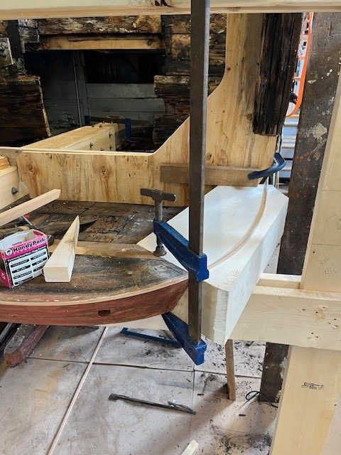 Using some of our 6”x12” yellow cedar timber stock, the starboard side of the lower stern ring is taking shape.