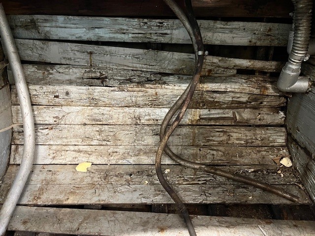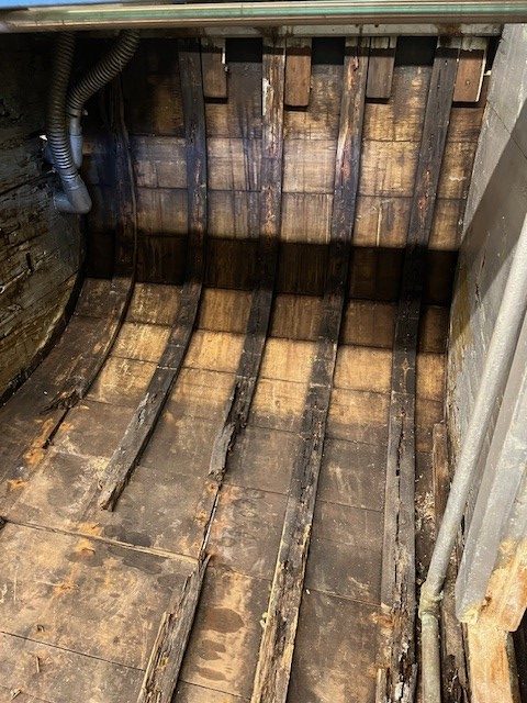 These photos from July 2025 show the fish hold of the Crystal S, as revealed after the boat’s middle section floor boards and hull liner pieces were removed to expose the hull framing.